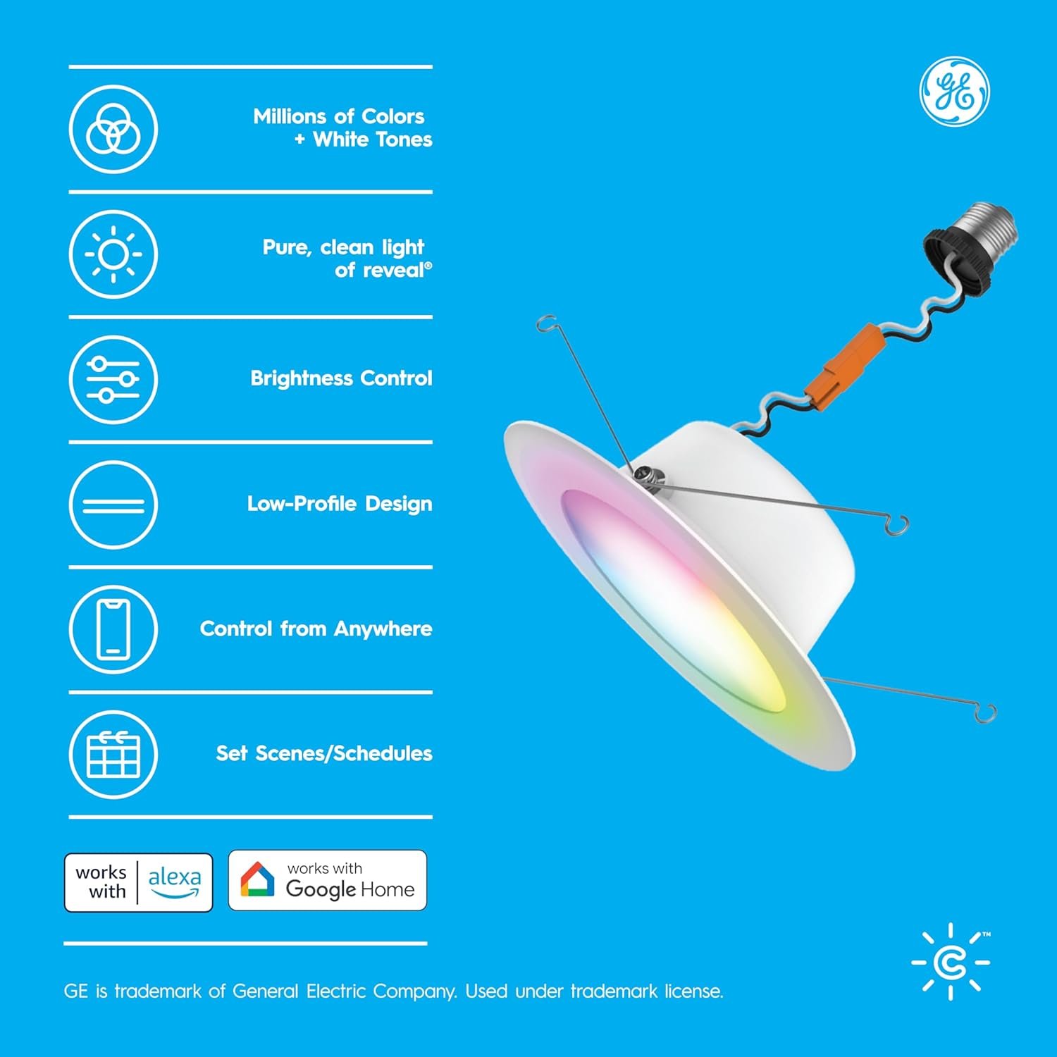 The GE Cync Reveal HD+ Full Color Smart LED Wafer Light provides enhanced control, scheduling, and millions of vibrant colors to enhance any space – no recessed can housing needed. Select from a wide range of white color tones from 2000K to 7000K and pinpoint the perfect choice for LED work lights, basement lights, kitchen lights and much more. The tunable white spectrum offered by these smart LED lights supports your sleep/wake cycle and creates the perfect scene for winding down or waking up. Choose from millions of additional colors with this light to enhance the vibe for parties and holiday décor. The LED color lights are simple to set up and work right out of the box through the intuitive Cync app, powered by Savant, which allows for remote Cync light control. Take advantage of smart lighting for home control and scheduling even when you’re away on vacation. Get even more out of these Wifi LED lights with voice control that works with Google Home, Amazon Alexa, and Matter-compatible voice assistants.